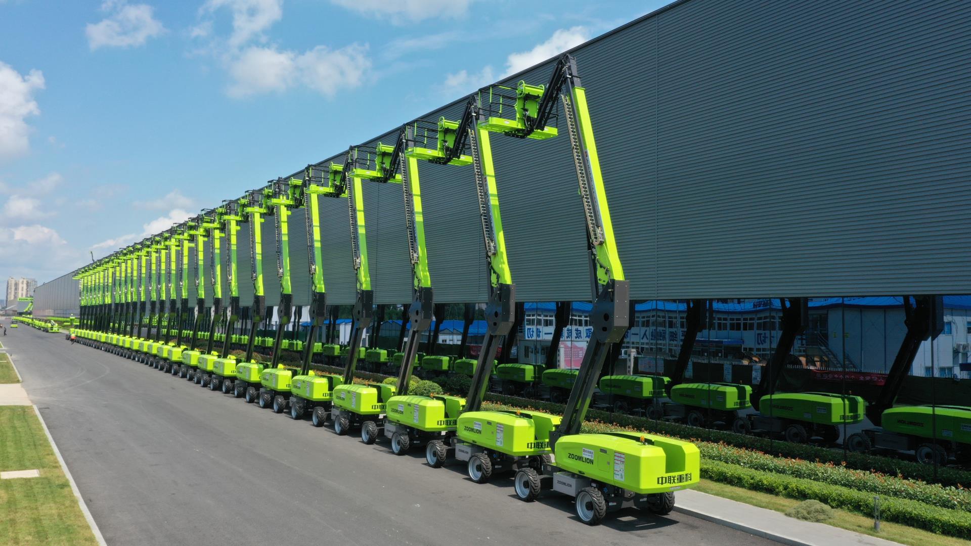 ▲排隊裝車的中聯(lián)重科智能高機產(chǎn)品