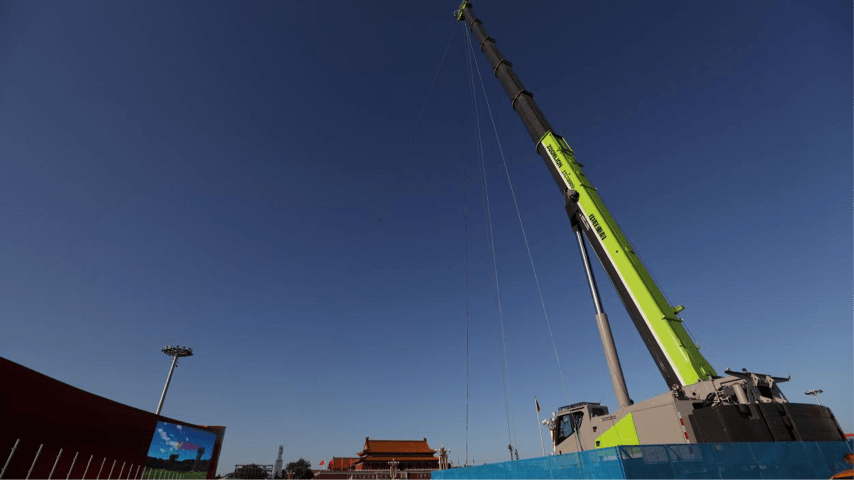 ▲中聯(lián)重科汽車起重機(jī)聳立在天安門廣場(chǎng)架設(shè)天鷹座拍攝系統(tǒng)助力大慶直播