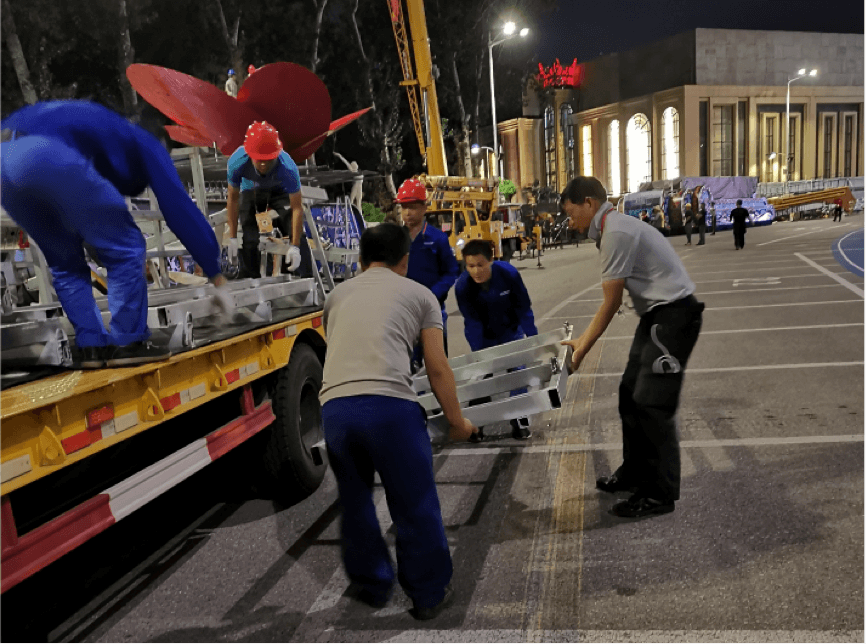 ▲湖南彩車制作小組副組長(zhǎng)王旭虹與組員一起搬運(yùn)物料