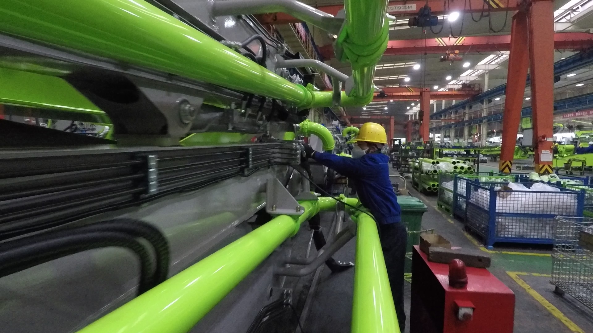 214日 在經(jīng)過(guò)消毒防疫的車(chē)間里,中聯(lián)重科一名戴著口罩的工人正在組裝泵車(chē)產(chǎn)品