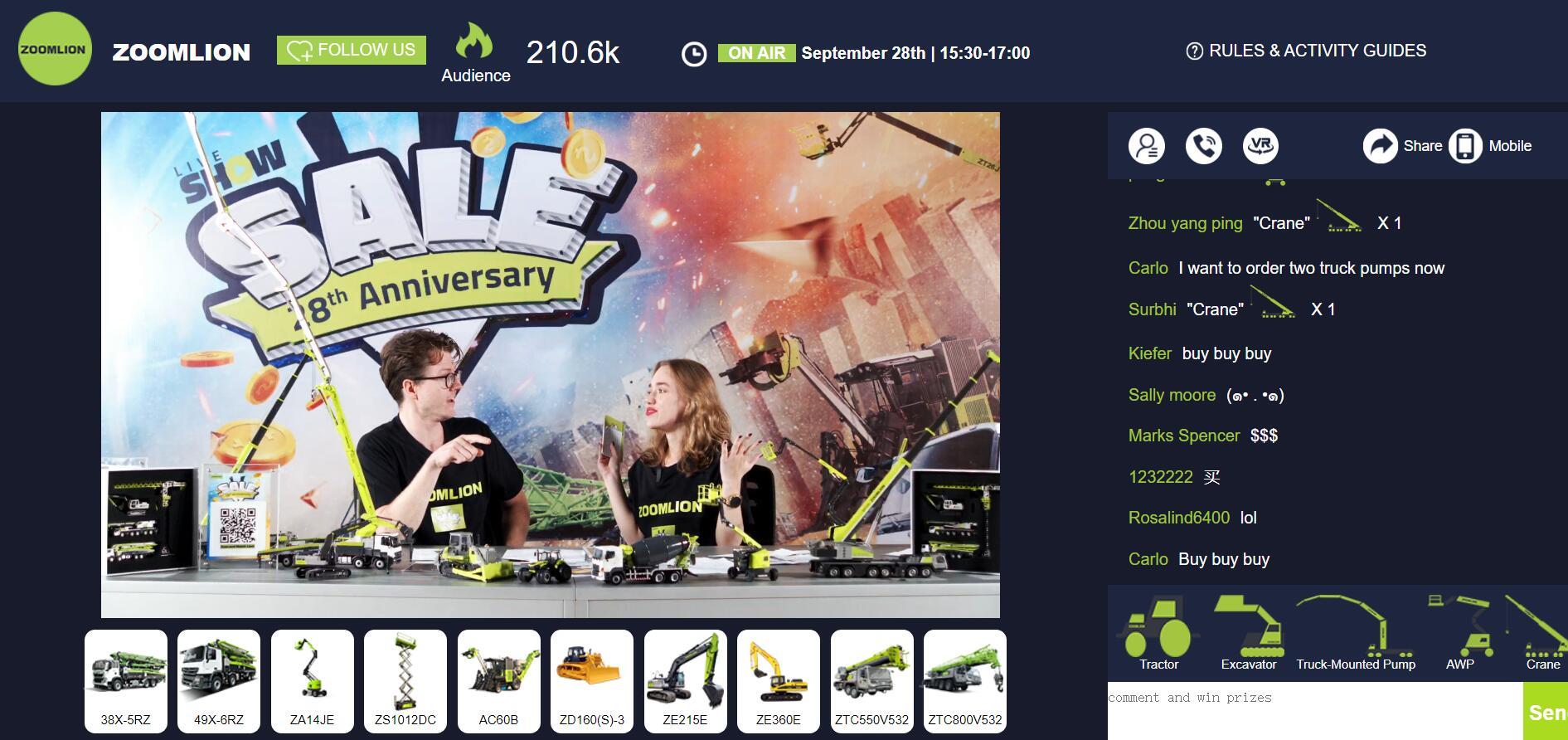 9月28日下午,中聯(lián)重科“928海外嗨購(gòu)節(jié)”盛大舉行,活動(dòng)吸引了來(lái)自全球各地的客戶、代理商觀摩,在線觀眾數(shù)量突破23萬(wàn),并以2.06億元的帶貨成果為海外直播寫(xiě)下了良好的開(kāi)篇。
