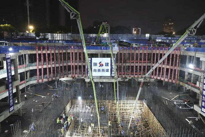 該項(xiàng)目基坑深度近20米,筏板**厚處為7.55米,整個(gè)基礎(chǔ)底板澆筑工程采用多點(diǎn)同時(shí)澆筑,從中心向四周,由深到淺,斜面分層施工,整體一次完成澆筑。為應(yīng)對(duì)跨晝夜深基坑連續(xù)作業(yè),項(xiàng)目方經(jīng)過(guò)多方對(duì)比,**終選擇中聯(lián)重科設(shè)備承擔(dān)重任。