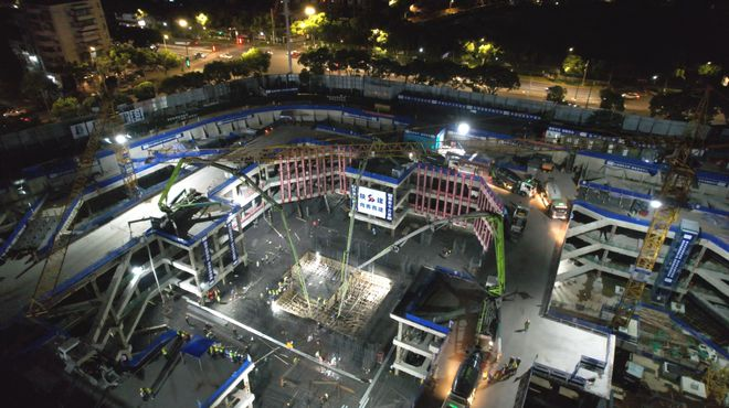 7月31日20時(shí),這場(chǎng)澆筑“車輪戰(zhàn)”正式拉開帷幕。中聯(lián)重科56米、63米及數(shù)臺(tái)“凌云Ⅱ”62米泵車,以及三臺(tái)22MPa車載泵進(jìn)駐施工一線,面對(duì)高溫條件下大體積混凝土澆筑、超70小時(shí)深基坑不間斷施工、地下空間狹小等諸多難題,3臺(tái)泵車和3臺(tái)車載泵同時(shí)作業(yè),憑借出色的穩(wěn)定性和可靠性大顯身手,澆筑沖刺階段峰值達(dá)260m3/小時(shí)。8月3日20時(shí),“小綠奇跡軍團(tuán)”不負(fù)期待,順利完成**后一方混凝土澆筑。