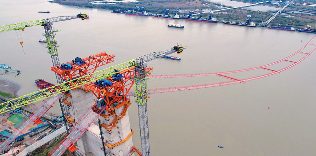 在長江上施工,大跨度和持續(xù)高空作業(yè)環(huán)境對施工安全構成極大挑戰(zhàn)。據(jù)了解,此次助力施工的是兩臺中聯(lián)重科W450-25HC平頭塔機,除了具備優(yōu)異的起重性能,起重量三重保護、力矩雙重保護、電控系統(tǒng)智能檢測保護和全新變頻回轉系統(tǒng)等功能讓設備在江邊和高空環(huán)境下也具備極致的操控性和可靠度。