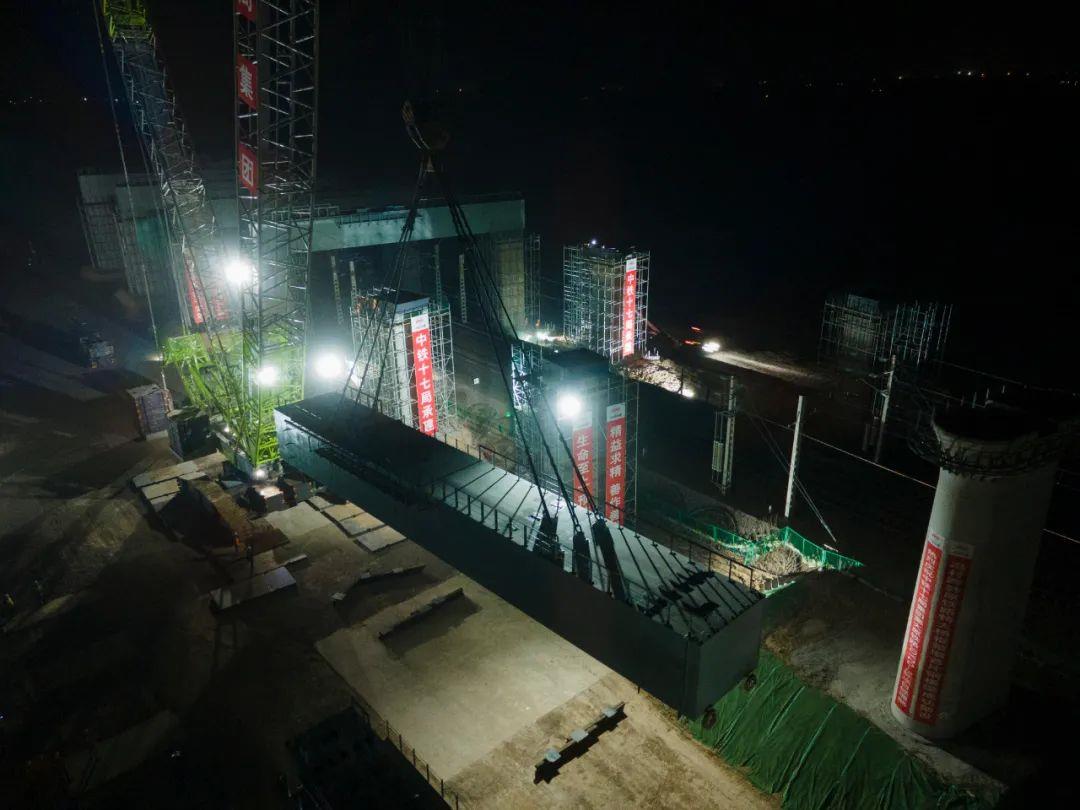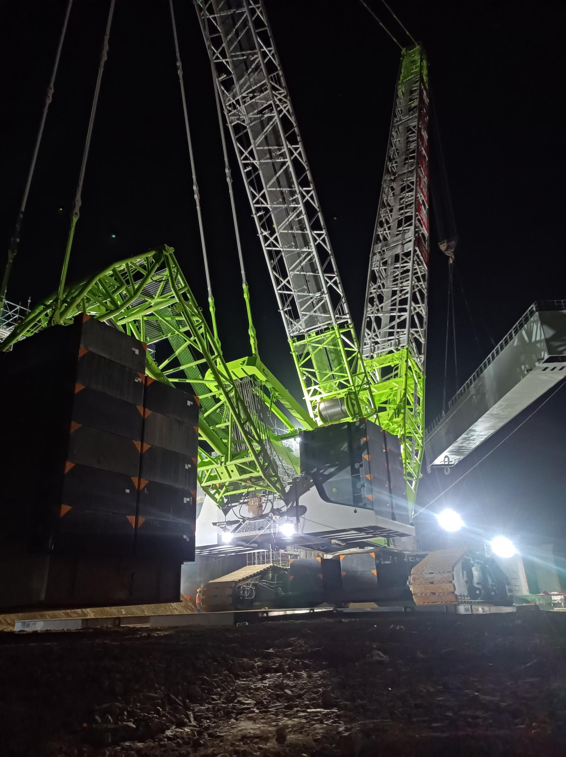 在中聯(lián)重科履帶吊吊裝的鋼橫梁中,有一榀長33.84米,寬4.58米,高3.5米,重達276.4噸,需要將其吊至離地面18米,相當于6層樓的高度,還要平穩(wěn)落在框架墩上,偏差要控制在毫米級,即使風力的影響都要嚴格計算,做到“繡花”一樣精細。4月20日凌晨,中聯(lián)重科千噸級履帶吊穩(wěn)穩(wěn)起吊橫梁,旋轉(zhuǎn)、擺正、下落、校正一氣呵成,施工用時不到30分鐘,贏得項目部高度贊譽。