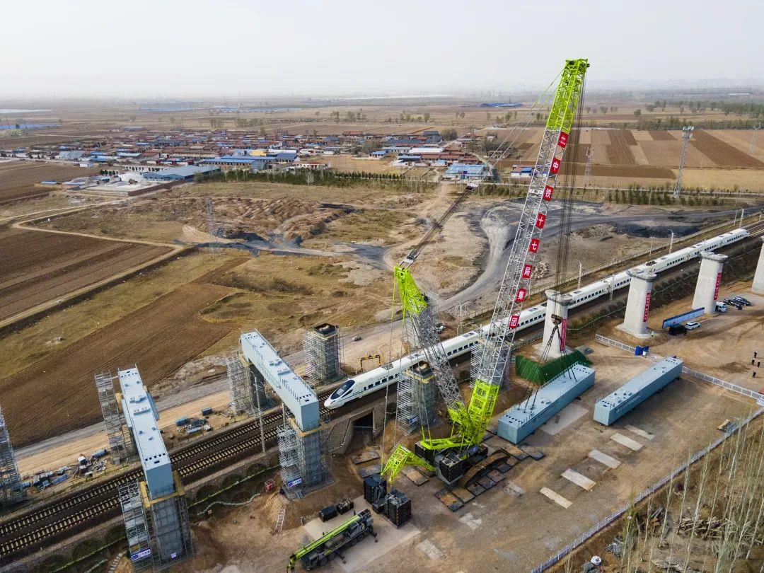 △列車駛過馮村跨韓原鐵路特大橋施工現(xiàn)場(圖片來源:中國鐵建)