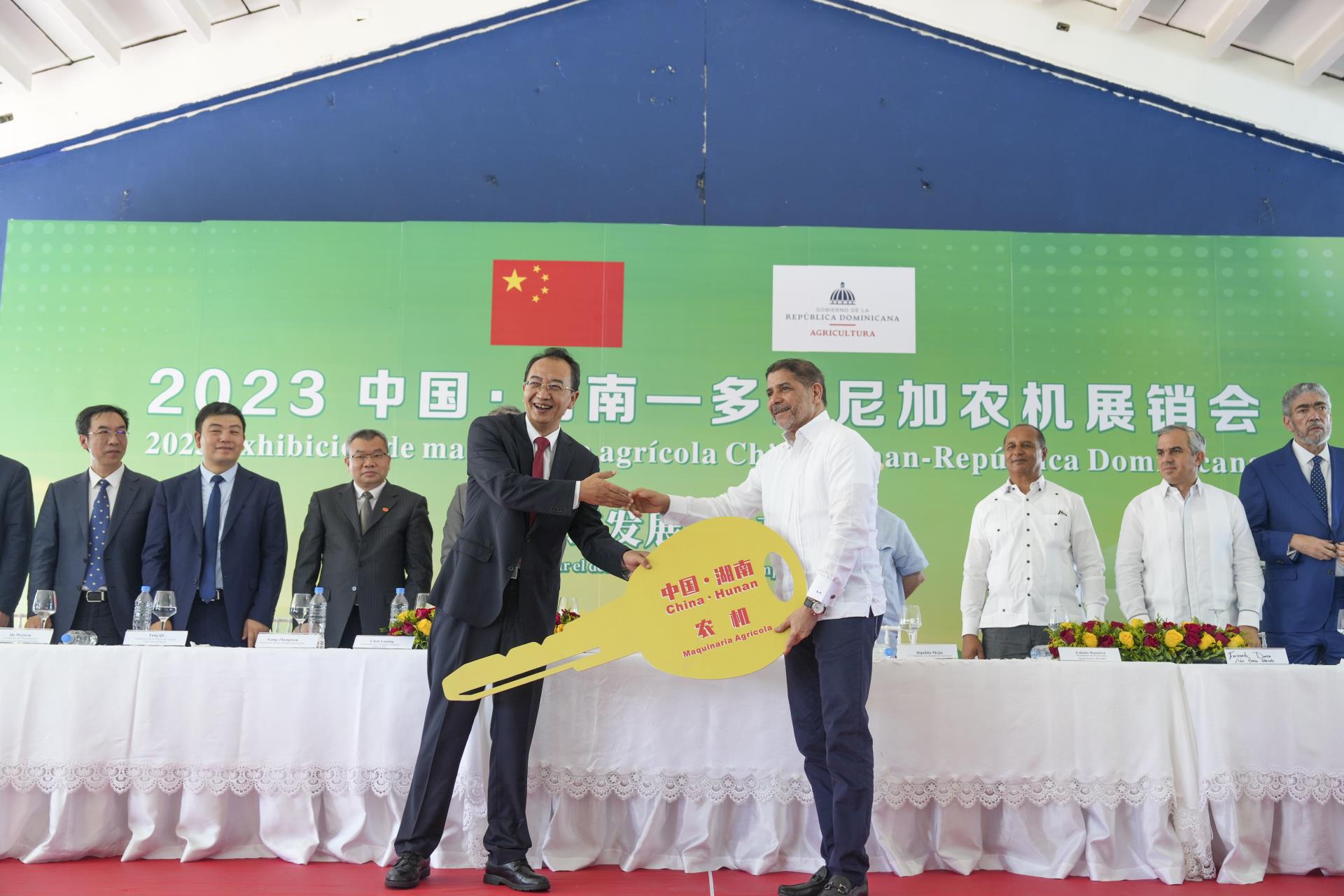 湖南省委常委、省委宣傳部部長楊浩東,中國駐多米尼加大使陳魯寧,多米尼加前總統(tǒng)伊波利托·梅希亞,多米尼加農(nóng)業(yè)部部長林博·克魯斯,中聯(lián)重科副總裁孫昌軍等出席開幕式。中國·湖南—多米尼加農(nóng)機展銷會為期3天,旨在加強湖南省與多米尼加在農(nóng)業(yè)領(lǐng)域的交流互鑒,深化雙方農(nóng)業(yè)合作,進一步提高多米尼加農(nóng)業(yè)生產(chǎn)效率和質(zhì)量,為多米尼加農(nóng)業(yè)機械化、現(xiàn)代化發(fā)展增添新動力,也為湖南省農(nóng)業(yè)企業(yè)國際化發(fā)展提供新機遇,實現(xiàn)互利共贏。
