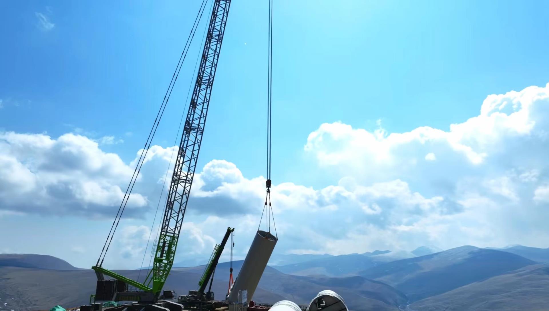中核薩迦30萬千瓦風(fēng)光儲一體化項目風(fēng)電場區(qū)位于喜馬拉雅山北麓,距離珠穆朗瑪峰僅140公里左右,**高海拔達(dá)到5193米,是目前世界上在建海拔**高、單體容量**大的風(fēng)電項目。此次吊裝風(fēng)機(jī)塔筒高102米,輪轂中心高105米,單葉片長度達(dá)90米,葉輪直徑達(dá)183米,吊裝的基礎(chǔ)海拔即高達(dá)4987米,總海拔高度達(dá)5092米。