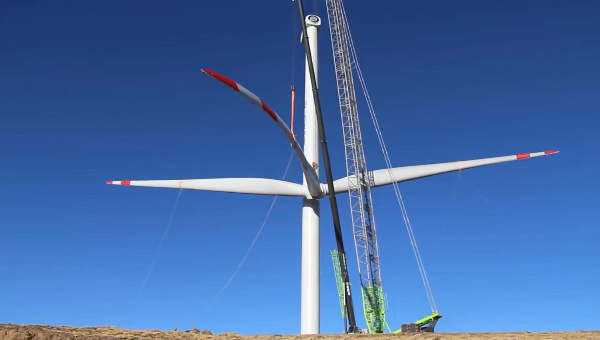 吊裝當(dāng)天,隨著總指揮一聲令下,一陣低沉而有力的轟鳴聲響起之后,首臺風(fēng)機(jī)的扇葉吊裝作業(yè)正式開始。吊裝設(shè)備緩緩上升,在中聯(lián)重科履帶式起重機(jī)和汽車吊順暢的動作下,巨大的風(fēng)機(jī)扇葉在空中劃過一道優(yōu)美的弧線,精準(zhǔn)地安裝在了塔筒頂部機(jī)艙上。